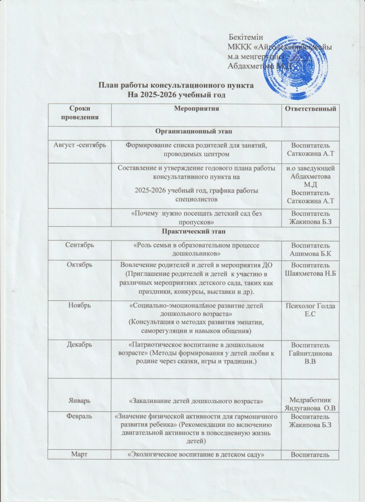 Консультациялық орталықтың 2025-2026 оқу жылына арналған жұмыс жоспары.