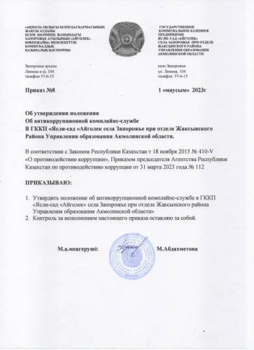 ГОСУДАРСТВЕННОЕ КОММУНАЛЬНОЕ КАЗЕННОЕ ПРЕДПРИЯТИЕ ЯСЛИ- САД "АЙГОЛЕК" СЕЛА ЗАПОРОЖЬЕ ПРИ ОТДЕЛЕ ЖАКСЫНСКОГО РАЙОНА УПРАВЛЕНИЯ ОБРАЗОВАНИЯ АКМОЛИНСКОЙ ОБЛАСТИ